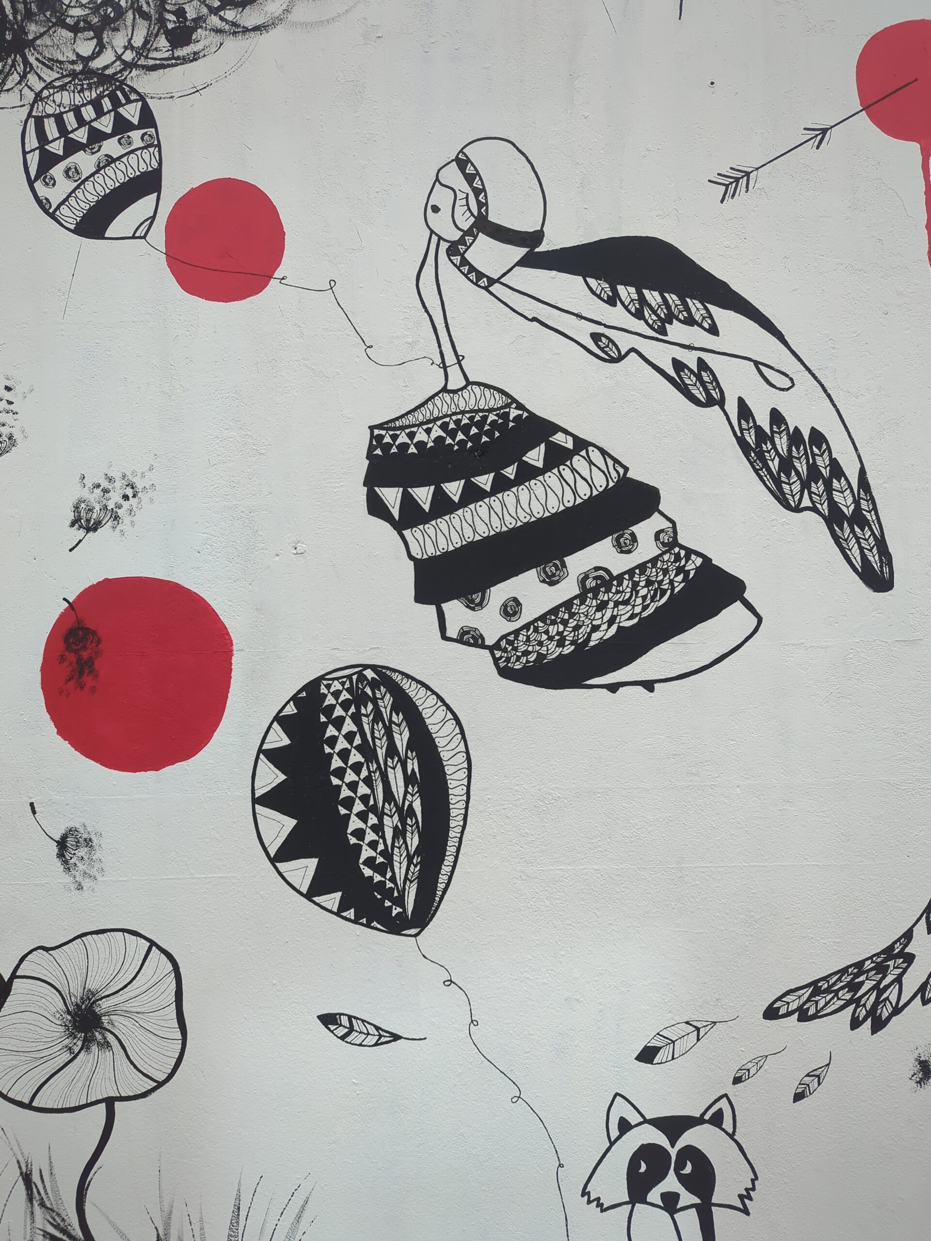 Le style de Fragola de la Vega repose sur un fort contraste visuel et une composition soignée. elle joue avec le noir et blanc et le contraste avec un rouge déchirant, les formes et la lumière pour donner une dimension narrative et immersive à ses fresques. Ses personnages sont souvent en mouvement, suspendus dans un espace presque irréel, créant un dialogue entre le spectateur et l’œuvre. Les imperfections naturelles, comme les coulures de peinture provoquées par la pluie, deviennent un élément poétique supplémentaire, enrichissant l’interprétation et la sensibilité de ses créations.